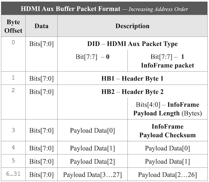 • For InfoFrames, the least-significant 5 bits of this byte contains the actual packet payload size, in bytes.