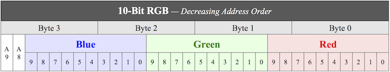 This format is identified by the NTV2_FBF_10BIT_RGB enumeration constant. For playout, the AJA device firmware converts the 10-bit RGB video data formatted as in the table below to the expected SMPTE-standard 10-Bit YCbCr output signal. Conversely, for capture/ingest, 10-bit YCbCr input video is converted into this 10-bit RGB pixel format: