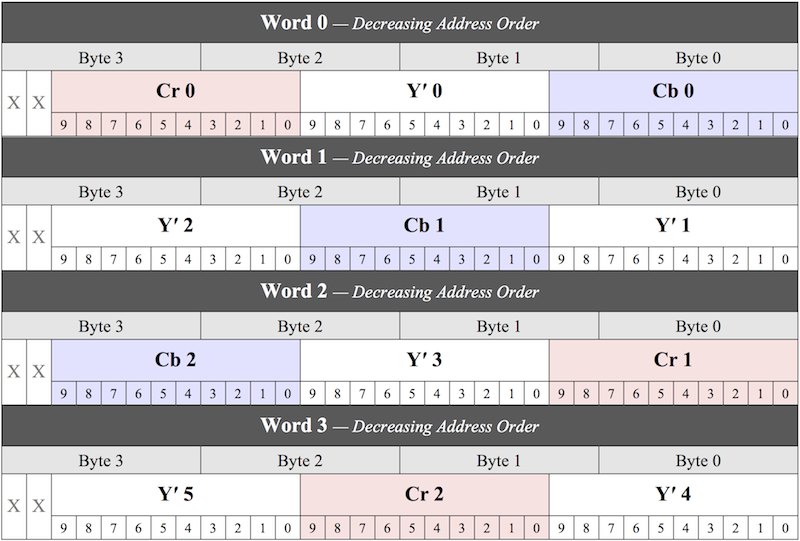 The remainder of this section describes how these formats are laid out in memory. Note that a hardware color-space converter will convert the SDI (YCbCr) input/output data to/from RGB as necessary for the RGB formats.