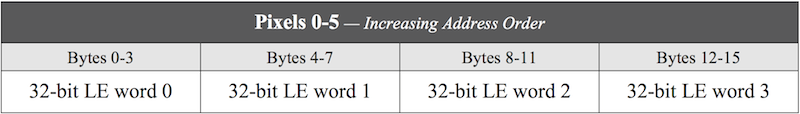 Here are the four 32-bit words (six pixels) in increasing address order: