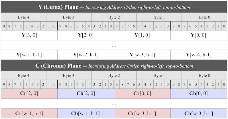 The chroma planes immediately follow the luma plane in memory, each being one-fourth the size of the luma plane, the Cb plane preceding the Cr plane. Chroma values are 10-bit (0-1023) values, stored identically to the luma values, one chroma value per 2x2 pixel quad (horizontal and vertical subsampling).