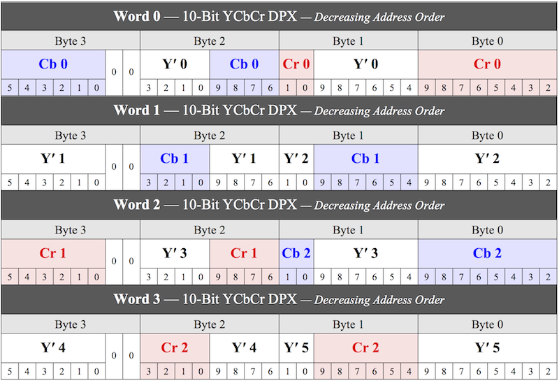 This format, identified by the NTV2_FBF_10BIT_YCBCR enumeration constant, has twelve 10-bit unsigned components that are packed into four 32-bit little-endian words (i.e. 6 pixels are represented in each 16 bytes). This is the format used in QuickTime movie files to store 10-bit YCbCr video and is referred to (by Apple and in MS-Windows) as the 'v210' format.
