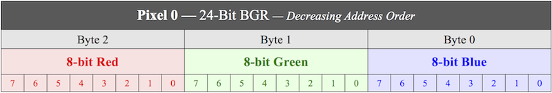 This format, identified by the NTV2_FBF_24BIT_BGR enumeration constant, has this single-pixel layout: