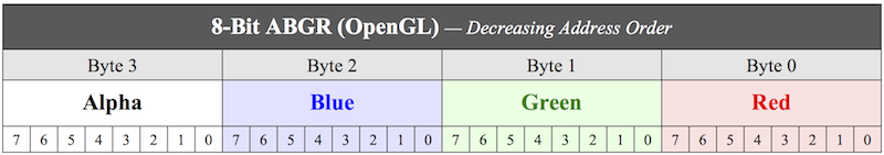 8-Bit ABGR, identified by the NTV2_FBF_ABGR enumeration constant, is used extensively with OpenGL: