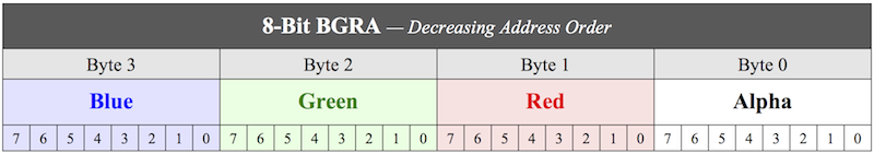 8-Bit BGRA, identified by the NTV2_FBF_RGBA enumeration constant, is used extensively on the MacOS platform: