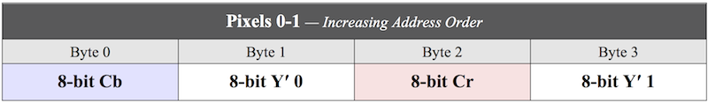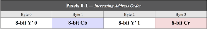 This format, identified by the NTV2_FBF_8BIT_YCBCR enumeration constant, is used by both Windows ('UYVY') and QuickTime ('2vuy') for 8-Bit YCbCr video. Here’s the memory layout of two pixels: