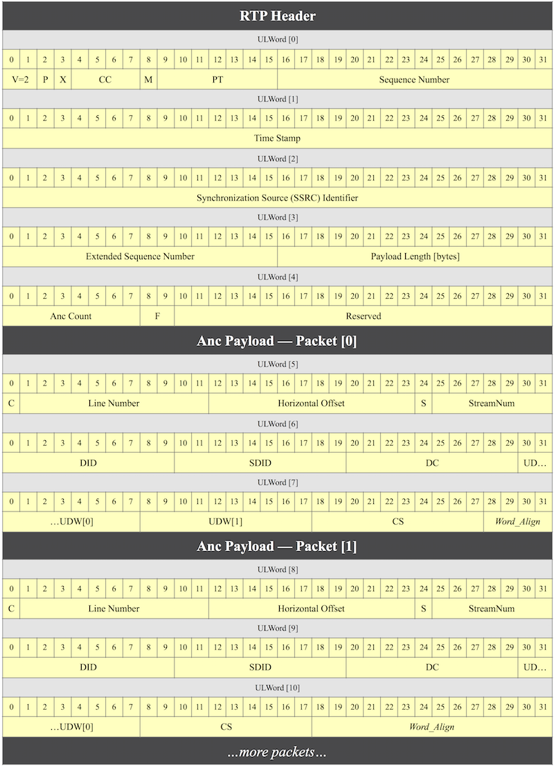 - Clients that generate the Anc data buffer contents themselves must set the Sequence Number field in the first longword of the RTP packet header to the total RTP packet bytecount, since AJA IP devices running 2110 firmware (KONA IP and Io IP) expect it there.