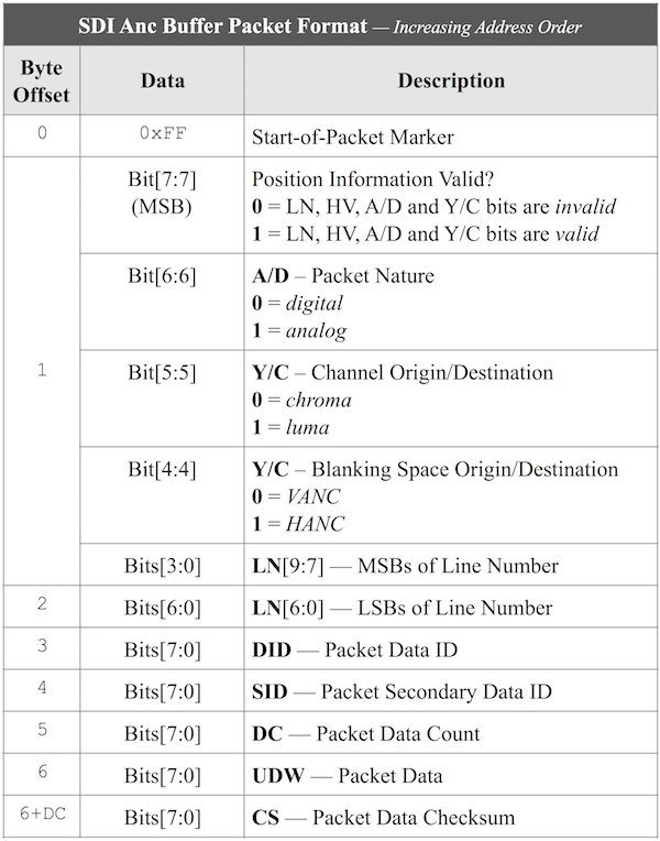 The data in the ancillary data buffer, except where noted (below), matches the RTP specification documented in SMPTE ST 291-1: