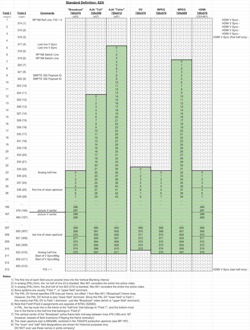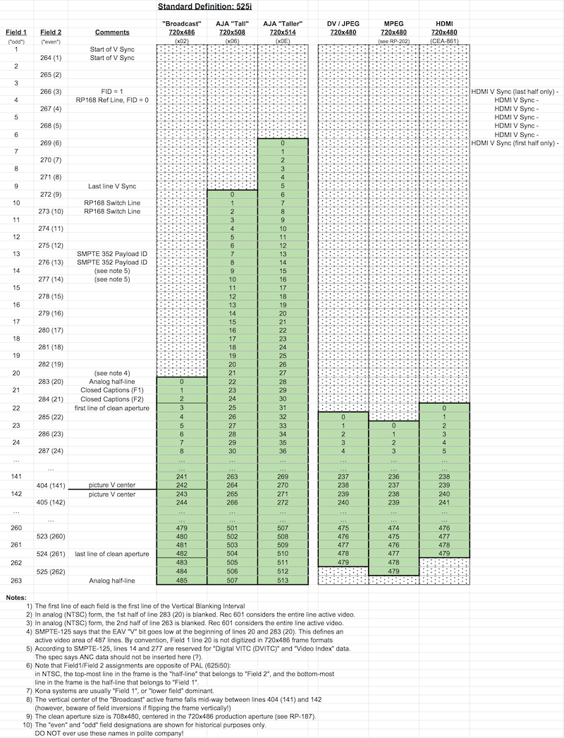 The spreadsheets that follow show, in detail for each video format, which lines contain VANC, and which ones contain video data.