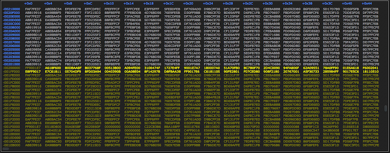 - Scroll down to the end of active video (EAV). This is where a noticeable boundary between illuminated and dimmed values indicate where changing pixel data ends. That offset – 0x00546000 – is the first safe (unchanging) byte of available ancillary buffer space.
