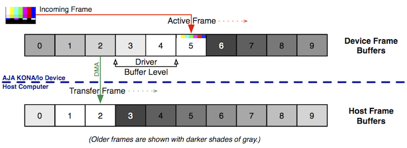Assuming a 29.97 fps full-frame rate, the AJA driver will bump the Active Frame to the next frame slot every 33 milliseconds. As long as the host application that’s transferring frames takes less than 33 milliseconds (including the DMA transfer time) to produce each frame, all will be well. If the host takes longer than 33 milliseconds to produce a frame, the Transfer Frame will start to fall behind, and the Buffer Level will decrease. If this is allowed to continue, the Active Frame will overtake the Transfer Frame, which will result in “dropped” frames that will end up being played more than once.