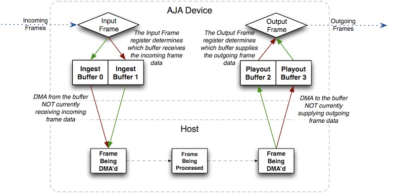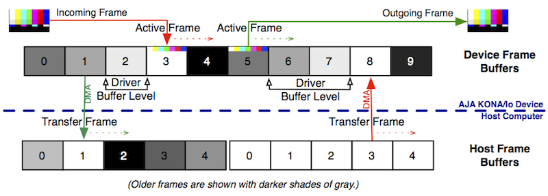 For capture, the frame written to the device frame buffer during the previous frame time is available for transfer after the vertical interrupt is received. However, audio can’t be transferred immediately, since audio is captured continuously, and all audio for the previous frame may not have been flushed to the device frame buffer yet. For this reason, AJA usually recommends transferring video and audio when there’s at least two frames in the queue — which may be unacceptable for low latency applications.