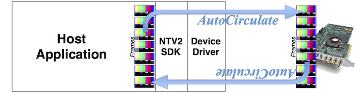 AutoCirculate is an API in the CNTV2Card class which allows real-time video streaming on a non-real-time host operating system. Video frames are buffered between the application software and the AJA device driver, and the driver is responsible for playing out (or capturing) those frames at the correct time.