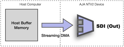 In playout, the AJA device firmware continually streams the video content of the Active Frame buffer to the output jack.