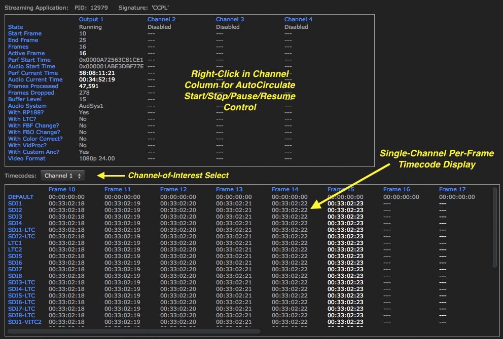 You can right-click in the AutoCirculate Channel column to pop up a menu to control AutoCirculate activity on that channel. This is handy for manually pausing, resuming, stopping or restarting AutoCirculate while your application runs.